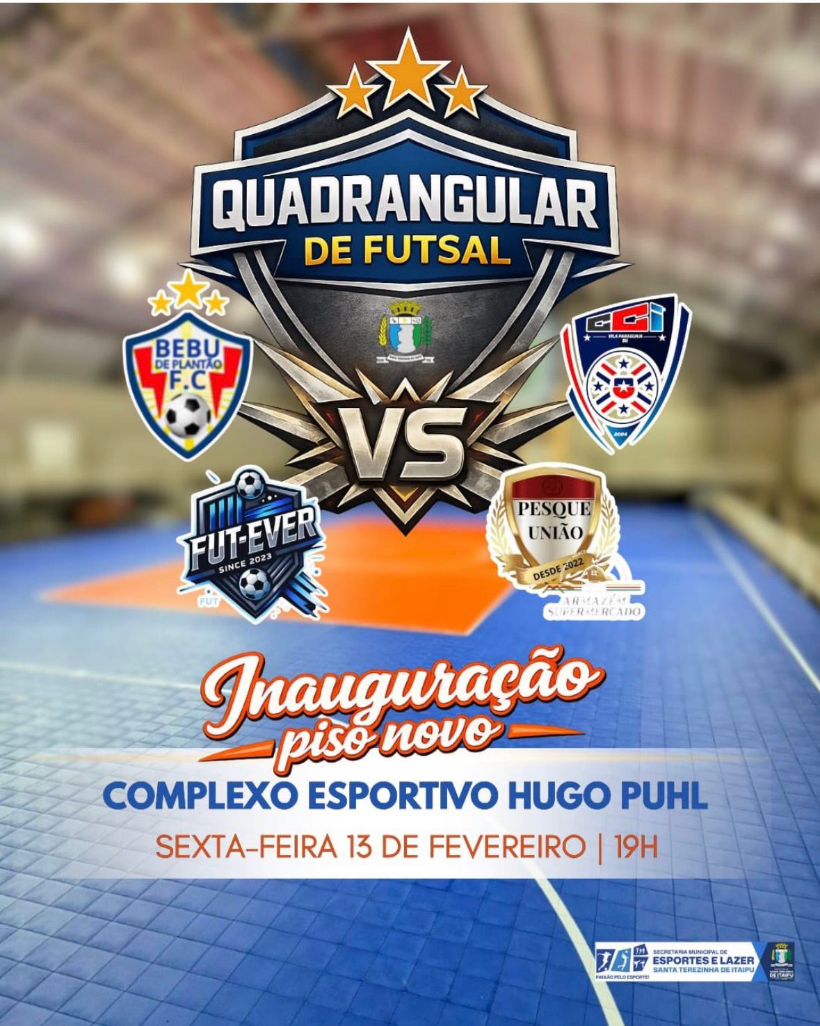 A Prefeitura de Santa Terezinha de Itaipu, por meio da Secretaria Municipal de Esportes e Lazer, convida toda a população para prestigiar a inauguração do novo piso do Complexo Esportivo Hugo Puhl, que acontece nesta sexta-feira, 13 de fevereiro, às 19h.