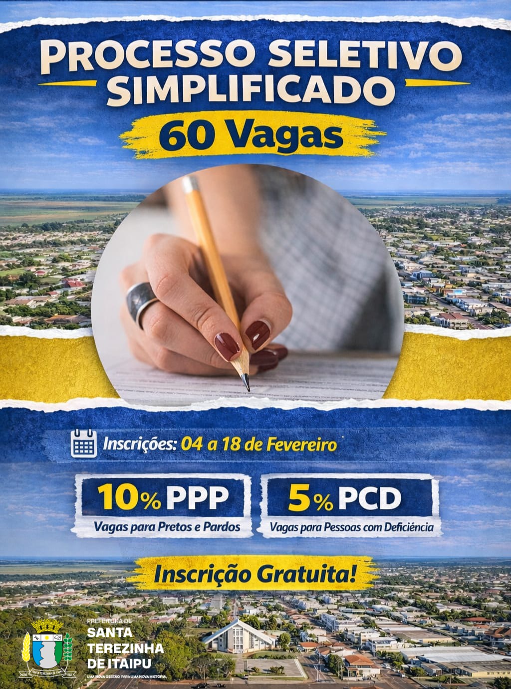 A Prefeitura Municipal de Santa Terezinha de Itaipu, publicou o Edital nº 001/2026 que regulamenta a abertura do Processo Seletivo Simplificado (PSS) para contratação de empregados públicos. Ao todo, estão previstas 60 vagas, sendo 20 para o cargo de Auxiliar de Serviços Gerais e 40 para Professor com graduação em Pedagogia, além da formação de cadastro reserva. Todas as inscrições são isentas de taxa.